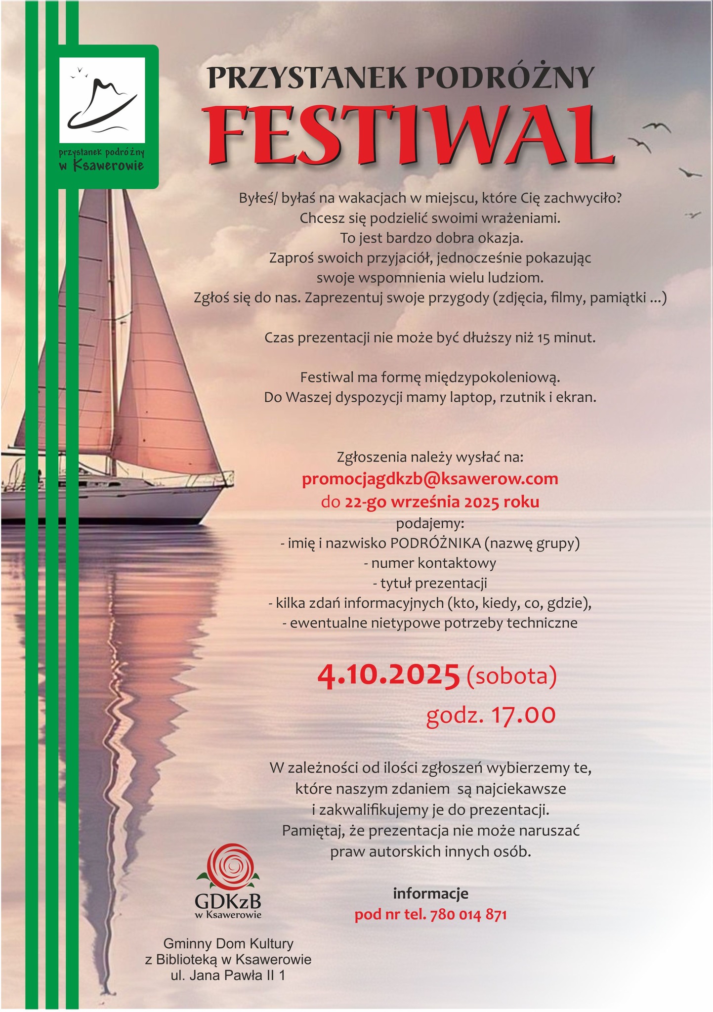 O co chodzi? Czekamy na Wasze zgłoszenia do Festiwalu PRZYSTANEK PODRÓŻNY. To WY – mieszkańcy Ksawerowa i okolic wystąpcie u nas w roli podróżników opowiadających o swoich wakacyjnych podróżach. 4-go października weźcie ze sobą rodziny i przyjaciół. Nie zapomnijcie o wcześniejszym zgłoszeniu. Więcej szczegółów na załączonym obrazku.