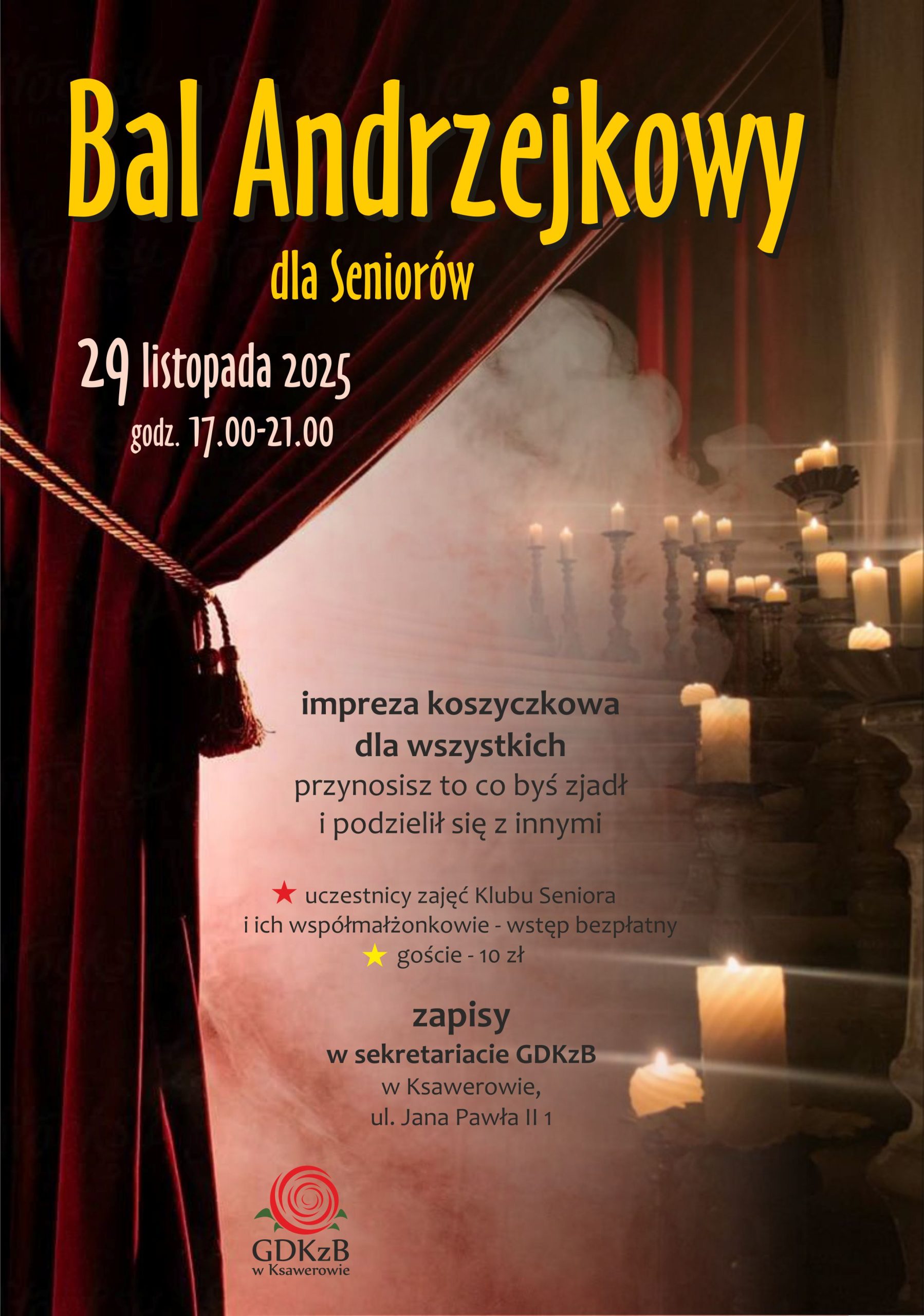 GDKzB zaprasza wszystkich seniorów na pełen ciepła, dobrej zabawy i wspólnego biesiadowania Bal Andrzejkowy. Wieczór odbędzie się w formule imprezy koszyczkowej — każdy przynosi to, co lubi, i dzieli się z innymi, tworząc atmosferę domowego, wspólnego stołu.