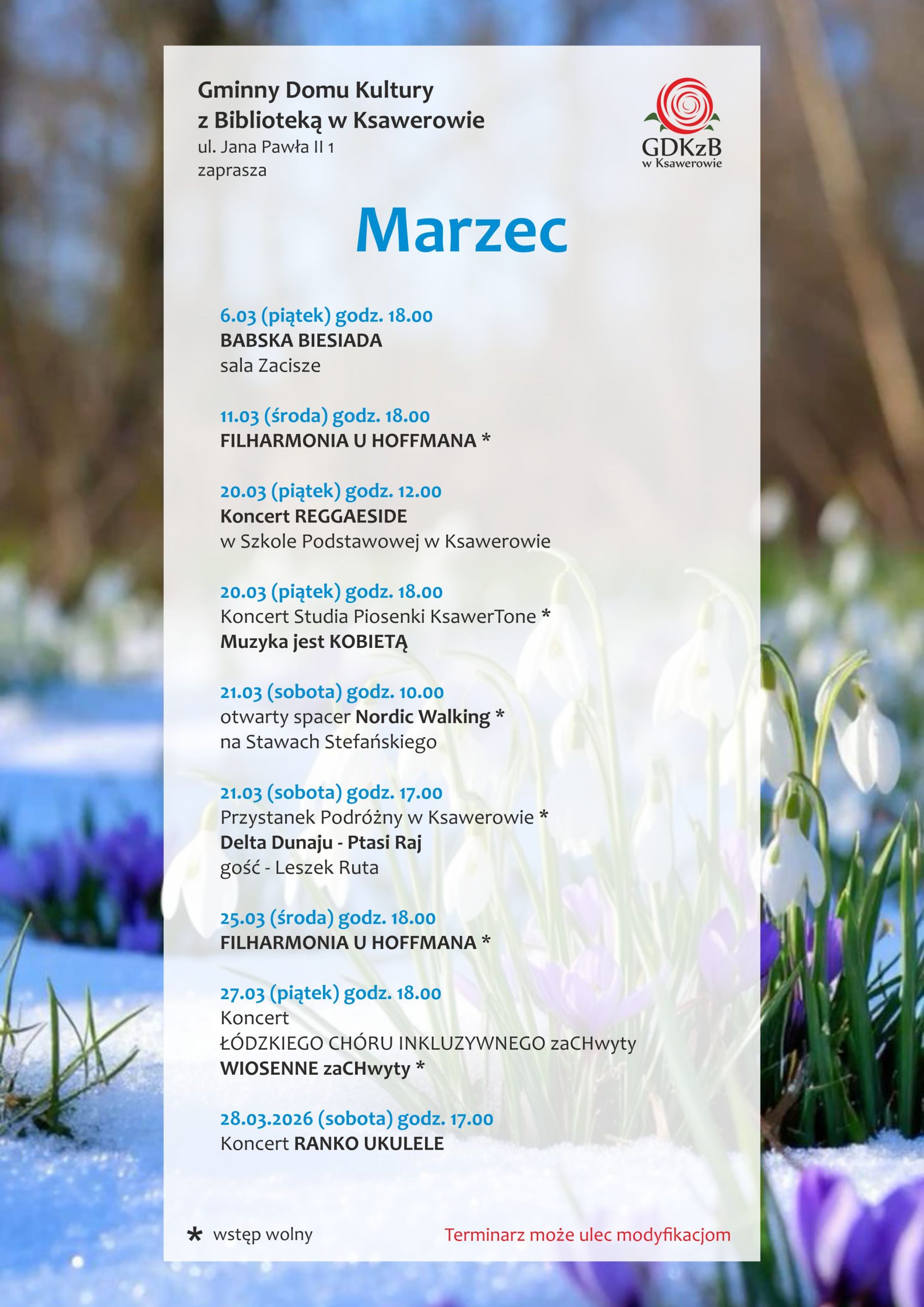 20 marca aż dwa wydarzenia. Najpierw organizujemy koncert dla młodzieży z naszych szkół. Na sali sportowej Szkoły Podstawowej w Ksawerowie wystąpi zespół Reggaeside, a po południu, jak zwykłe o godz. 18.00 na scenie domu kultury wystąpią wokalistki ze Studia Piosenki KSAWERTONE.