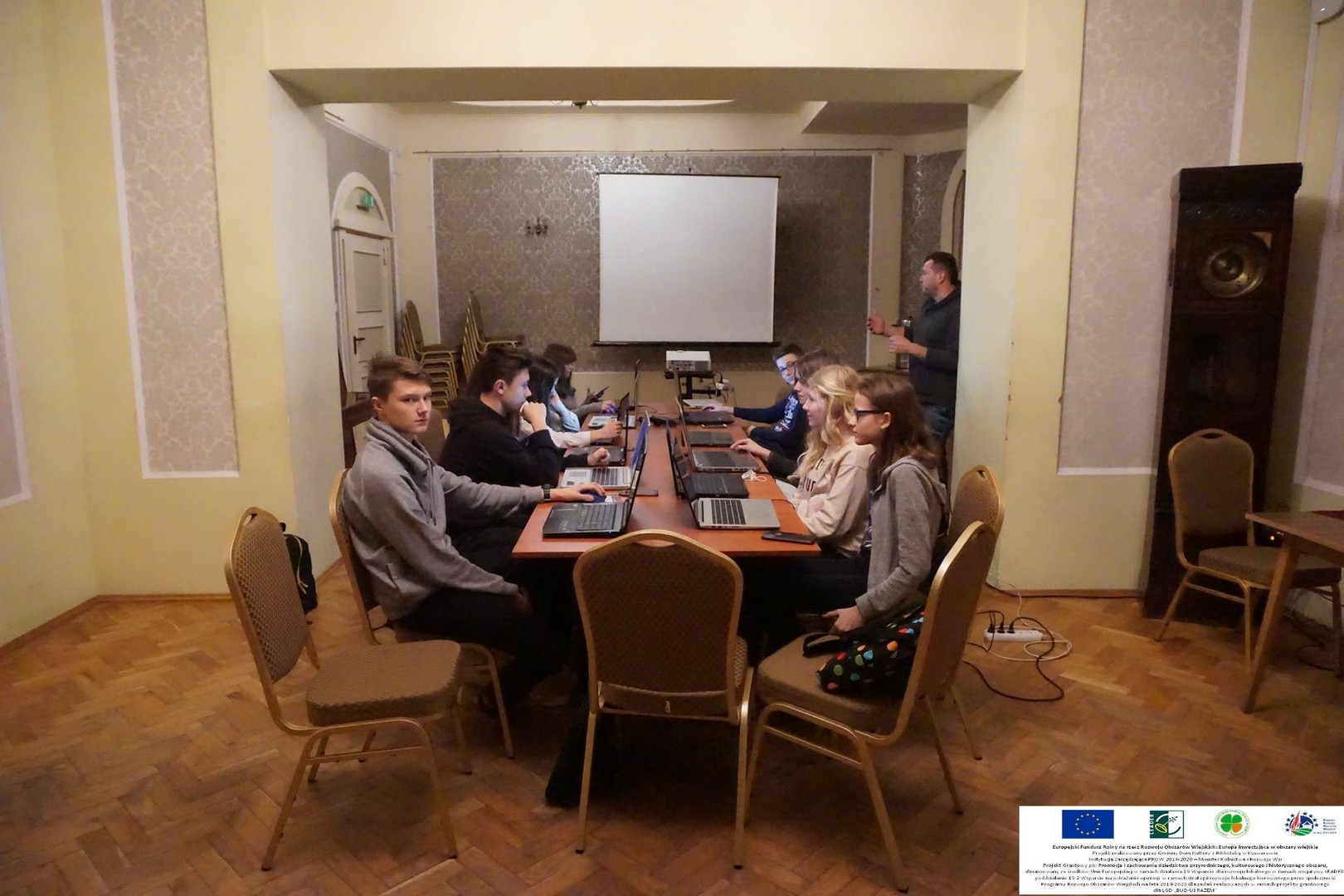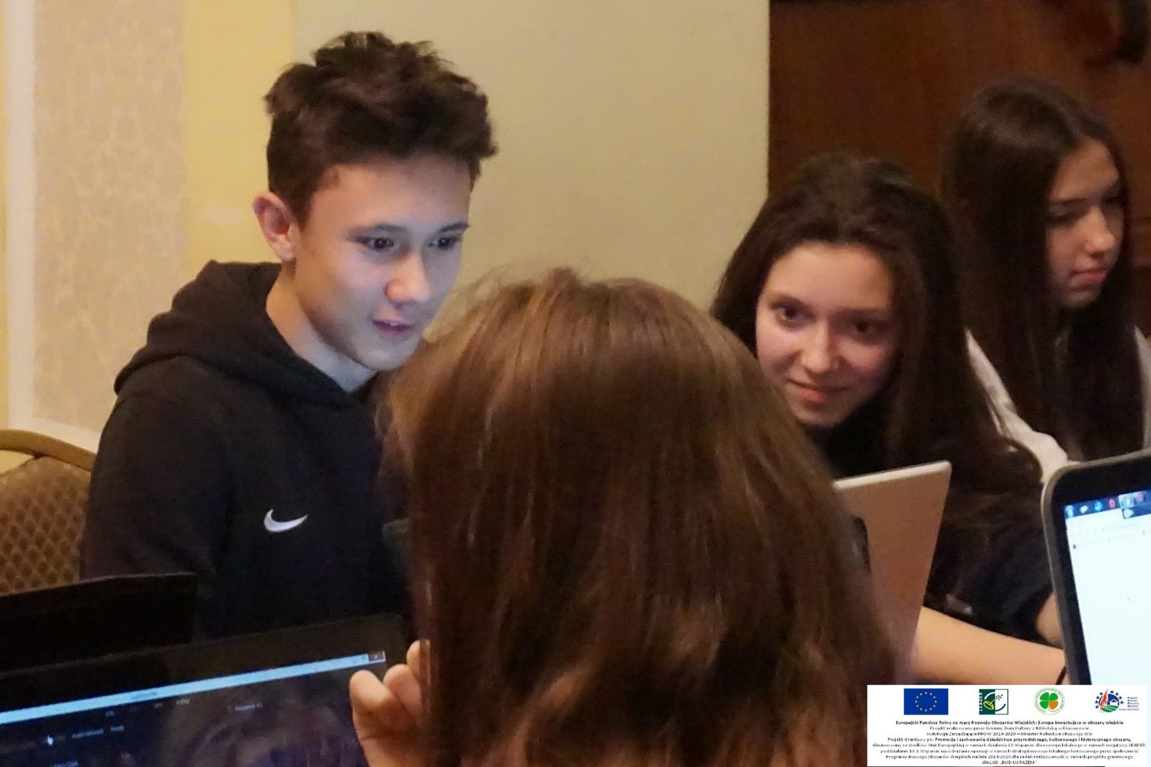 Dzień siódmy Siódmy dzień projektu Fotoplastykon za nami. Młodzież uczy się korzystać z programów do obróbki filmowej. Wszystkie ręce na pokład – tworzymy własne filmiki.