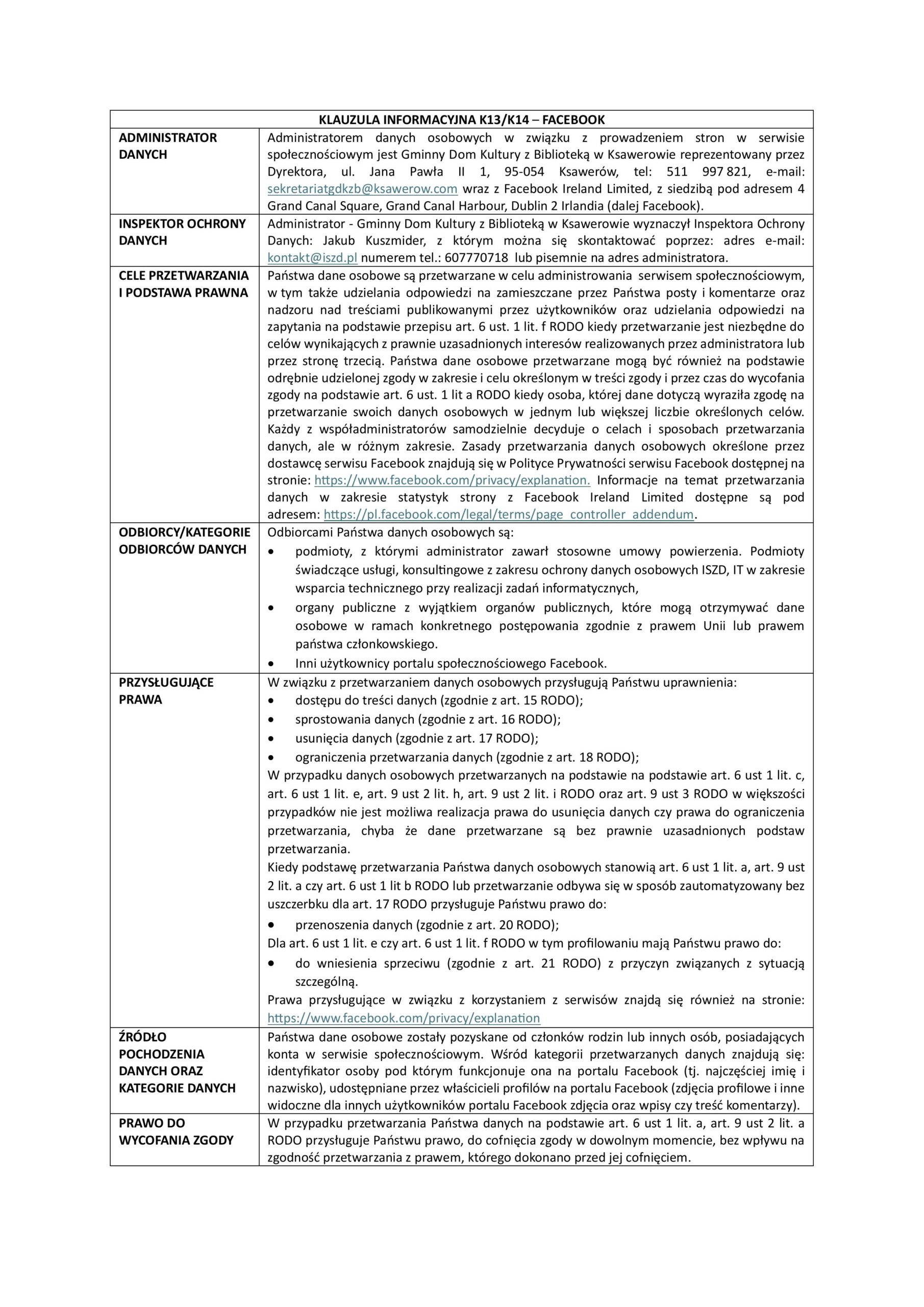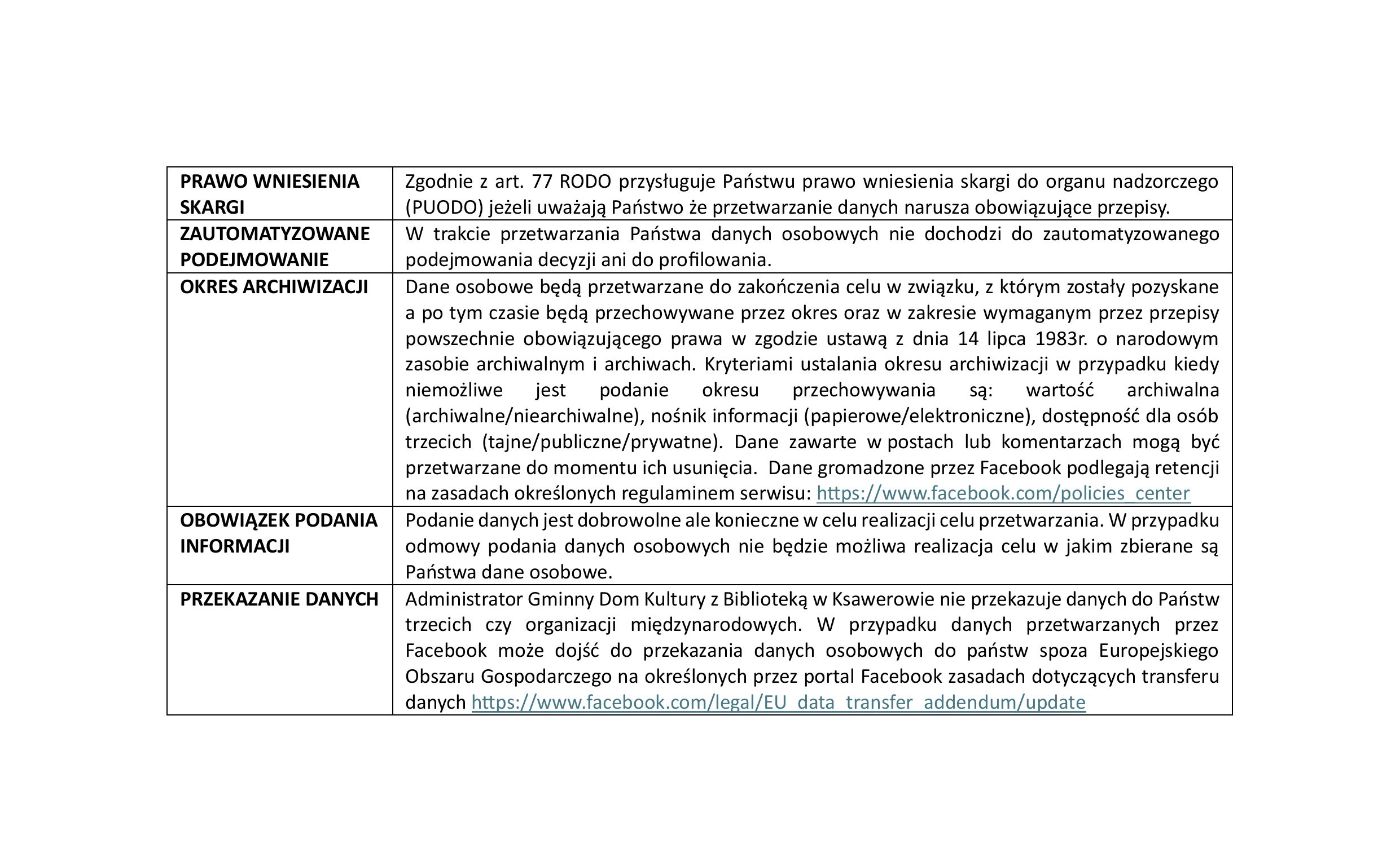 - Odbiorcą Państwa danych osobowych będą pracownicy jednostki na podstawie umów. Dostęp do przekazanych danych osobowych mają wyłącznie osoby działające z upoważnienia administratora. Osoby te zobowiązane są do zachowania tych danych w tajemnicy nawet po wygaśnięciu umowy wiążącej ich z Gminnym Domem Kultury z Biblioteką w Ksawerowie. Dane osobowe mogą być przekazane podmiotom zewnętrznym w ramach realizowanych przez nie usług na podstawie umów o powierzenie danych osobowych, a podmioty te są również zobowiązane do zachowania poufności przetwarzanych danych oraz zastosowania odpowiednich środków technicznych i organizacyjnych w celu zabezpieczenia danych.