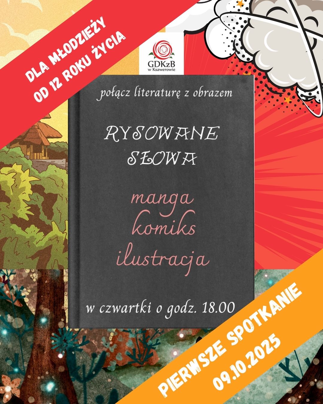 Rysowane Słowa to projekt łączący literaturę z sztuką wizualną. Wspólnie tworzymy ilustracje, komiksy i mangi na podstawie ulubionych książek czy opowiadań. Zależy nam, żeby w naszej bibliotece pojawiały się młode osoby, które zakochają się w świecie fantazji, zapisanym na kartach książek. Daj sobie przestrzeń na fantazję i przyjdź!